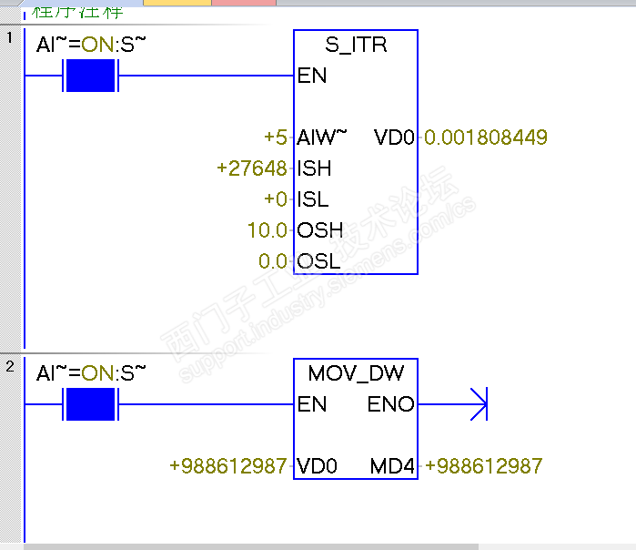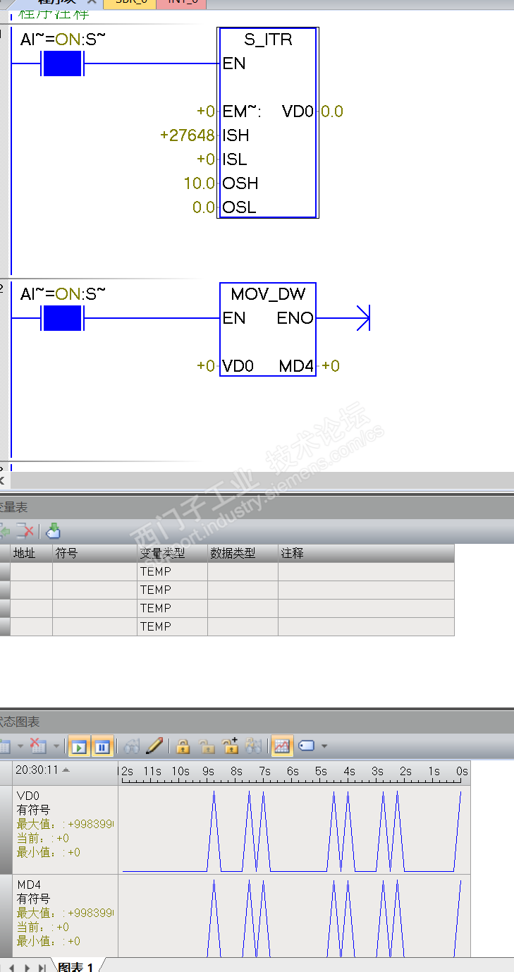 如图所示,模拟量输出,然后模拟量的输出VD0 和下面传送的VD0数值不一样呢?