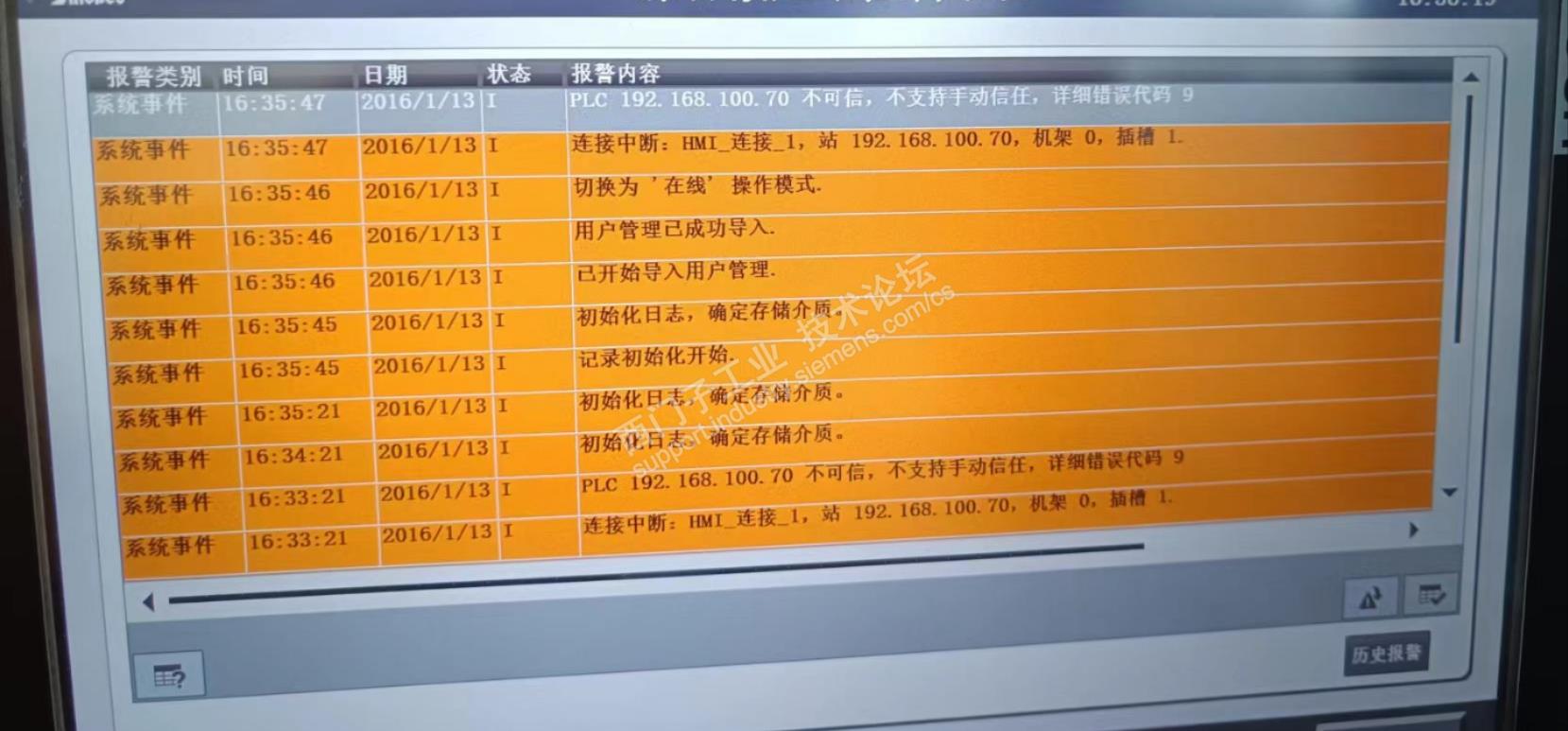 今天往一个精智屏里面下载项目 屏幕组态的版本是17.0.0.0 下载后无法连接PLC 一开始怀疑是触摸屏和PLC组态问题 反复检查 无果,但是使用触摸屏仿真是没有一点问题的 真是奇怪了 后来组态系统报警 发现实体触摸屏报错