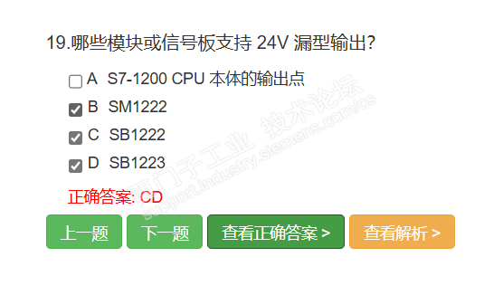 正确答案没有SM1222,题目是要求支持24v漏型输出,但1200样本里SM1222是支持24v漏型输出的
