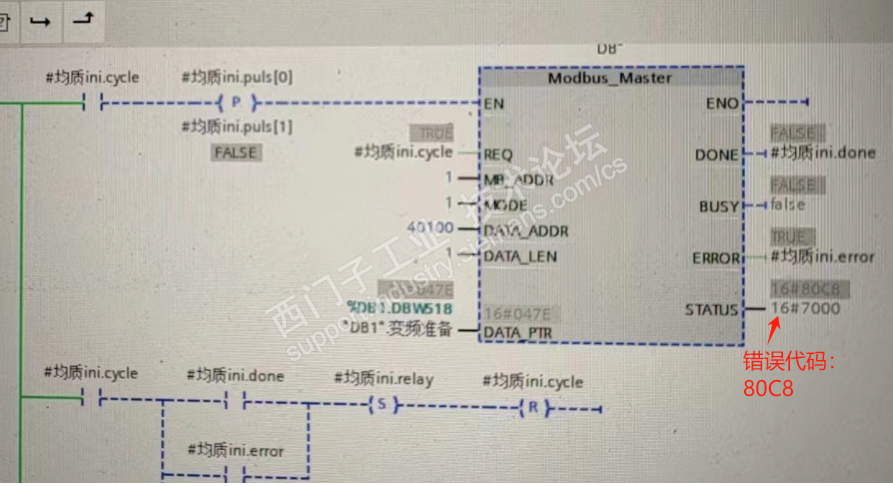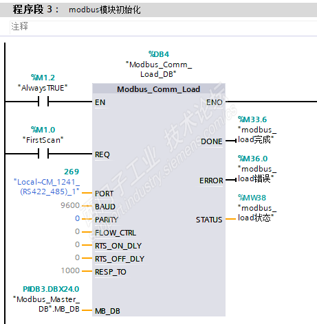 项目PLC采用S7 1214, 通信模块CM1241, Modbus RTU与一台变频器V20通信正常,一台柯力电子秤通信正常,但一台变频器G120XA一直通信失败,G120XA相关设置及编程如下,烦请教各位论坛技术大神们指点一下,感谢!