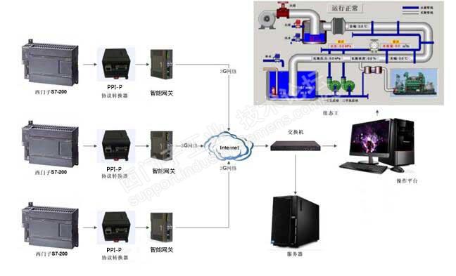 其中,智能网关通过PPI-P协议转换器与S7-200PLC连接,实现远程通讯网关对S7-200数据的采集以及对PLC运行状态的在线监测,再采用3G、wifi、GPRS等通讯技术,通过“专用安全通道”将采集到的数据传输至“实时端”。从而实现“实时端”对“应用端”实时数据采集及实时开关等操作。