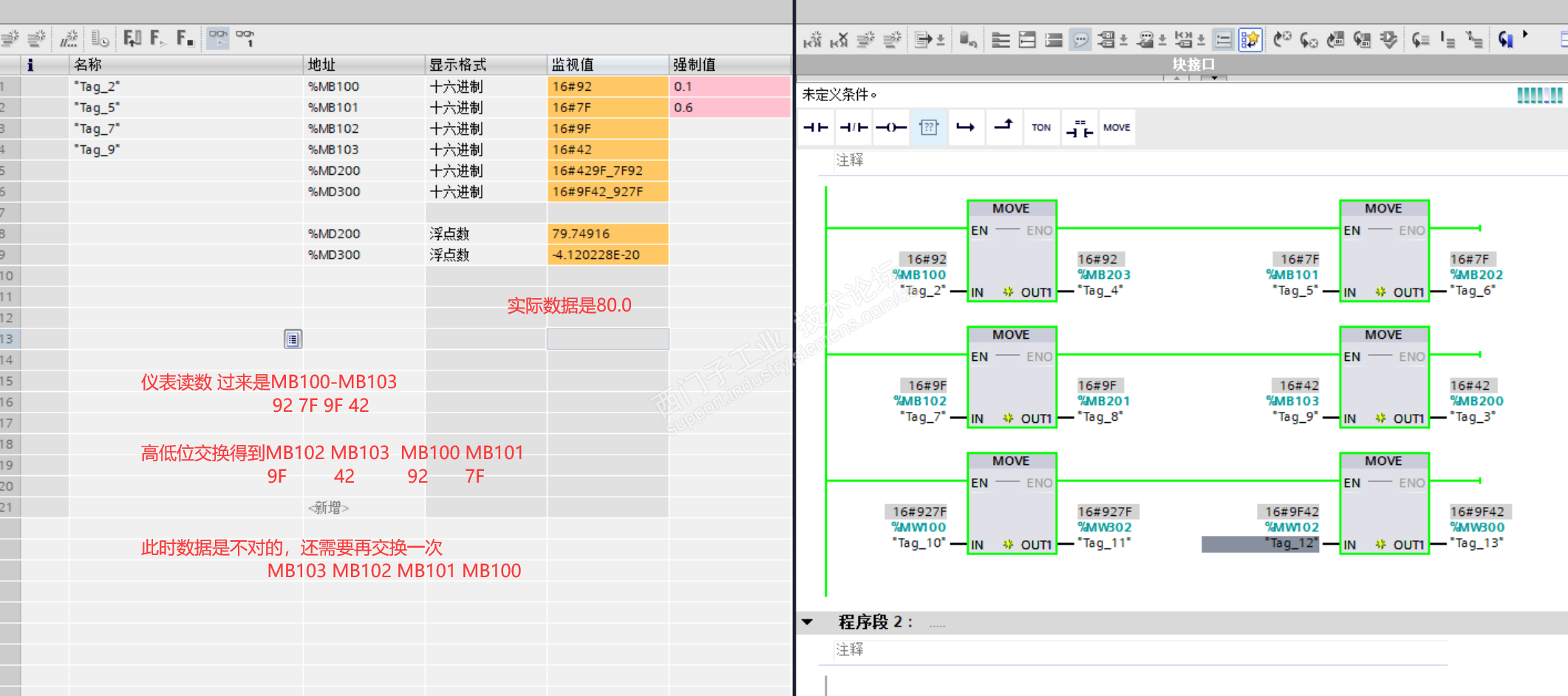 浮点数采用小端格式传输时低位在前(只读) 这段话取自仪表说明书 可也没有说,是1234 换成4321 正常交换1234变成34 12 如何才能直接获取正确排序,哪种通用多一点