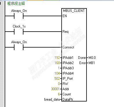 我发现MBUS_CLIENT只能设置IP地址和端口号,不能设置服务器的设备地址;通过接收数据发现,PLC发送过去的数据,服务器设备地址都是0XFF,也就是广播。