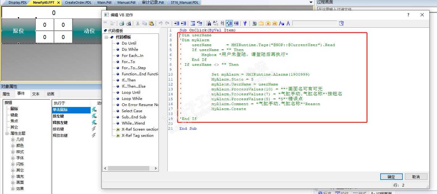 我在wincc 中做了一个气缸的画面封装,在触发的按钮脚本中 添加了 审计追踪的功能,但是脚本不运行,找不到具体原因,恳请大家帮忙看一下,谢谢!~