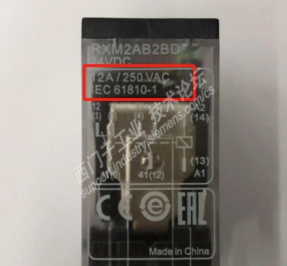2、 继电器外壳上标识的触点额定容量(如下图)一般都是250VAC,电阻性负载下对应电流。对应到DC13负载,其额定电流大为减小,例如12A/250VAC电阻性负载对应到DC13负载,24VDC电压下其额定电流<2A 。因此,用于驱动电磁阀线圈类应用,触点电流应按DC13负载下电流选型,且其值应大于实际工作电流2倍以上。