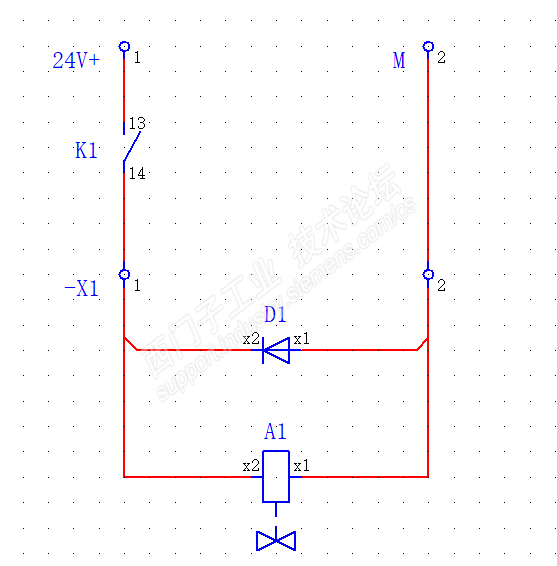 1、搭建试验平台,测试在电磁阀线圈两端反向并联续流二极管,让电磁阀线圈产生的自感电动势通过续流二极管在内部消耗掉,原理图如下图。通过在试验平台测试,反向并联二极管后,驱动同样的负载,继电器触点打火现象明显减弱。
