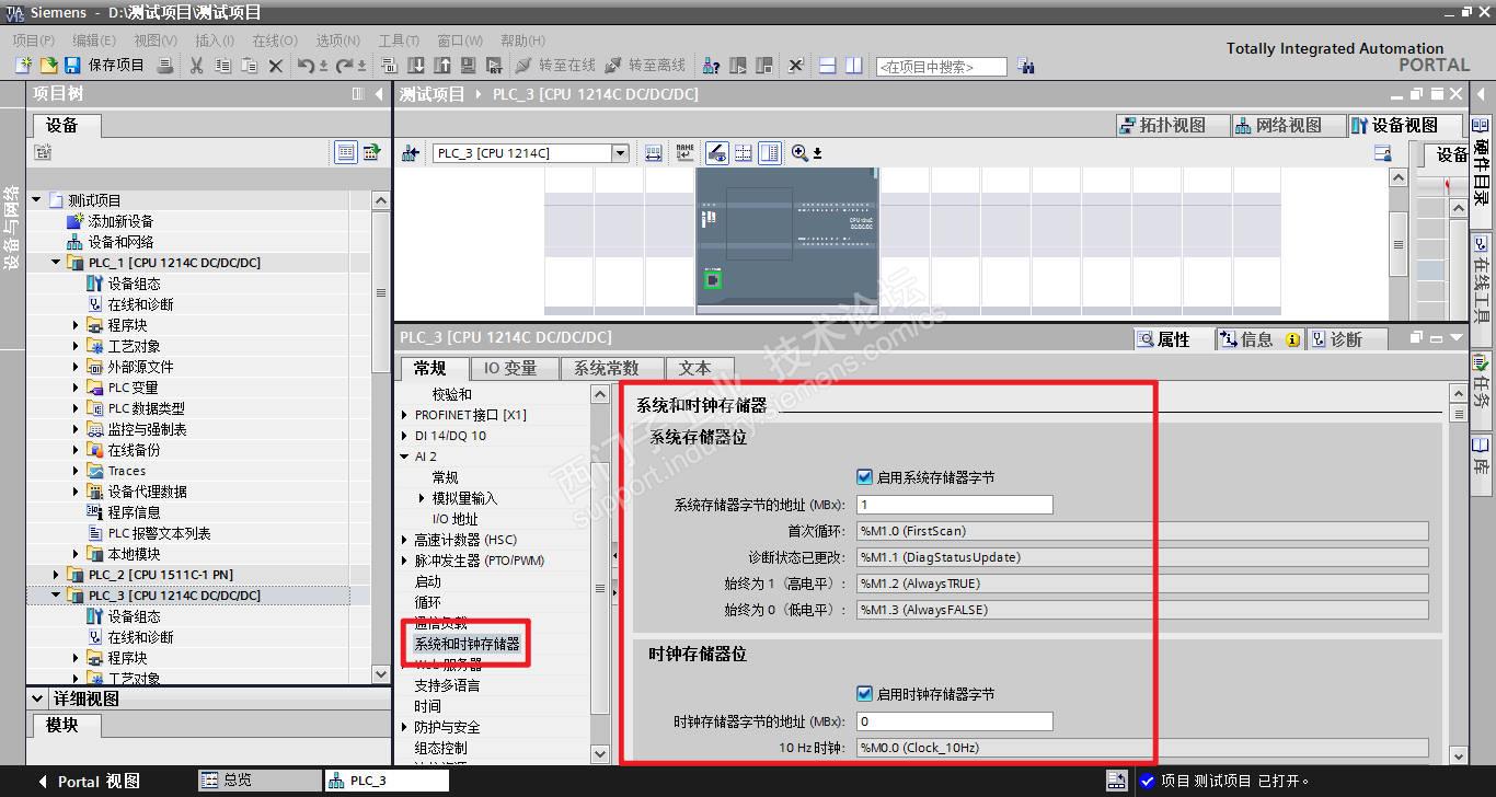 1) 新建一个测试项目,并定义系统时钟及系统标志位MB1及调用OB100,图示: