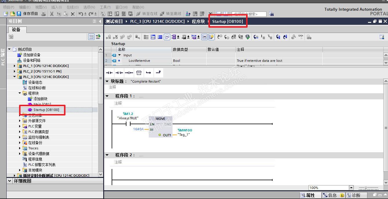 验证硬件cpu是s7-1214C,将2个数据从2个位置分别赋值给同一个变量,看结果情况。如果是具备优先执行逻辑理念,那么,赋值传送的结果一定是First Scan标志位传送的那个值,OB100赋值传送数据被First Scan标志位赋值传送数据所覆盖。
