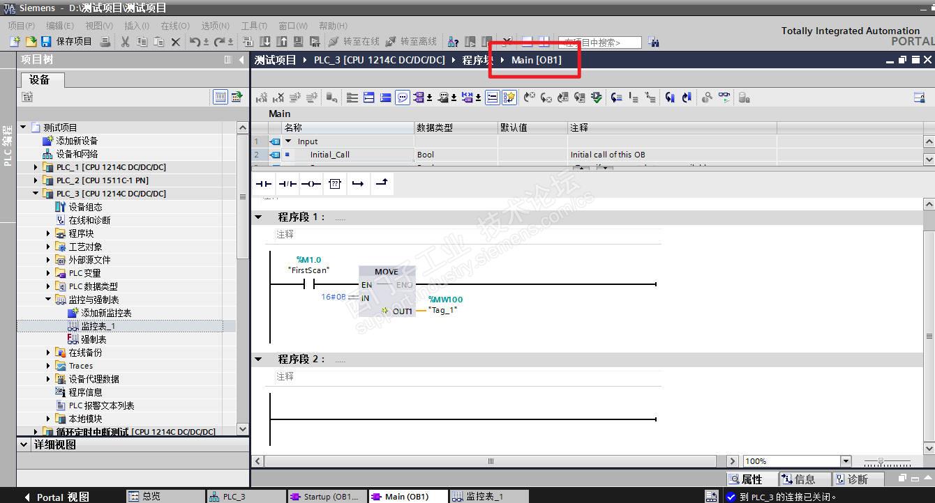 监控的结果符合验证前的想法,说明OB100优先于First Scan系统标志位执行程序段,由此说明组织块优先的说法是正确的。