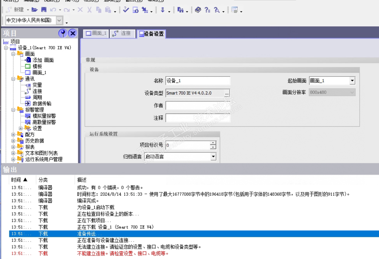 各位好,最近使用Smart 700 IE V4精彩触摸屏时,出现了下载不进去的情况,反复下载尝试,依然报不能建立连接故障。