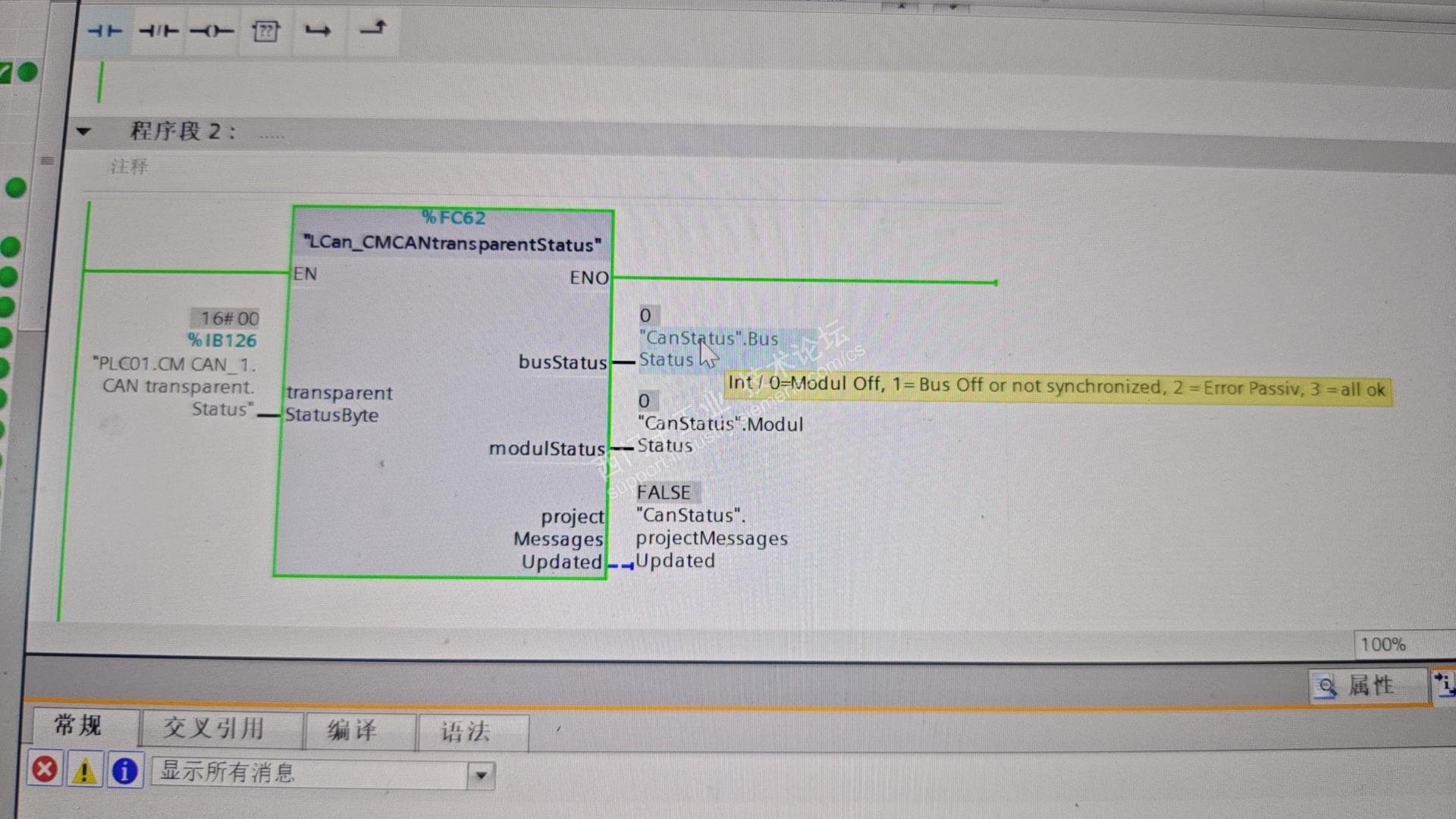 想请教一下各位大佬有没有关于1512-1 PN和CAN2.0B设备通讯的资料,我手上只有DBC通讯矩阵,使用的6ES7 137-6EA00-0BA0这块CAN通讯卡,按照手册,先按照ID吧CAN 透明传输组态完成后把CAN H和CAN L以及129欧接地连接卡件后,Config块已经显示status为0000 0000模块未启动,根据手册,下一步就应该status变成0000 0001和0000 0003了,可是现在一直卡在0000 0000,数据也读不上,通过第三方can2.0B设备已经确定设备在发送消息了。请问有人做过这个通讯吗