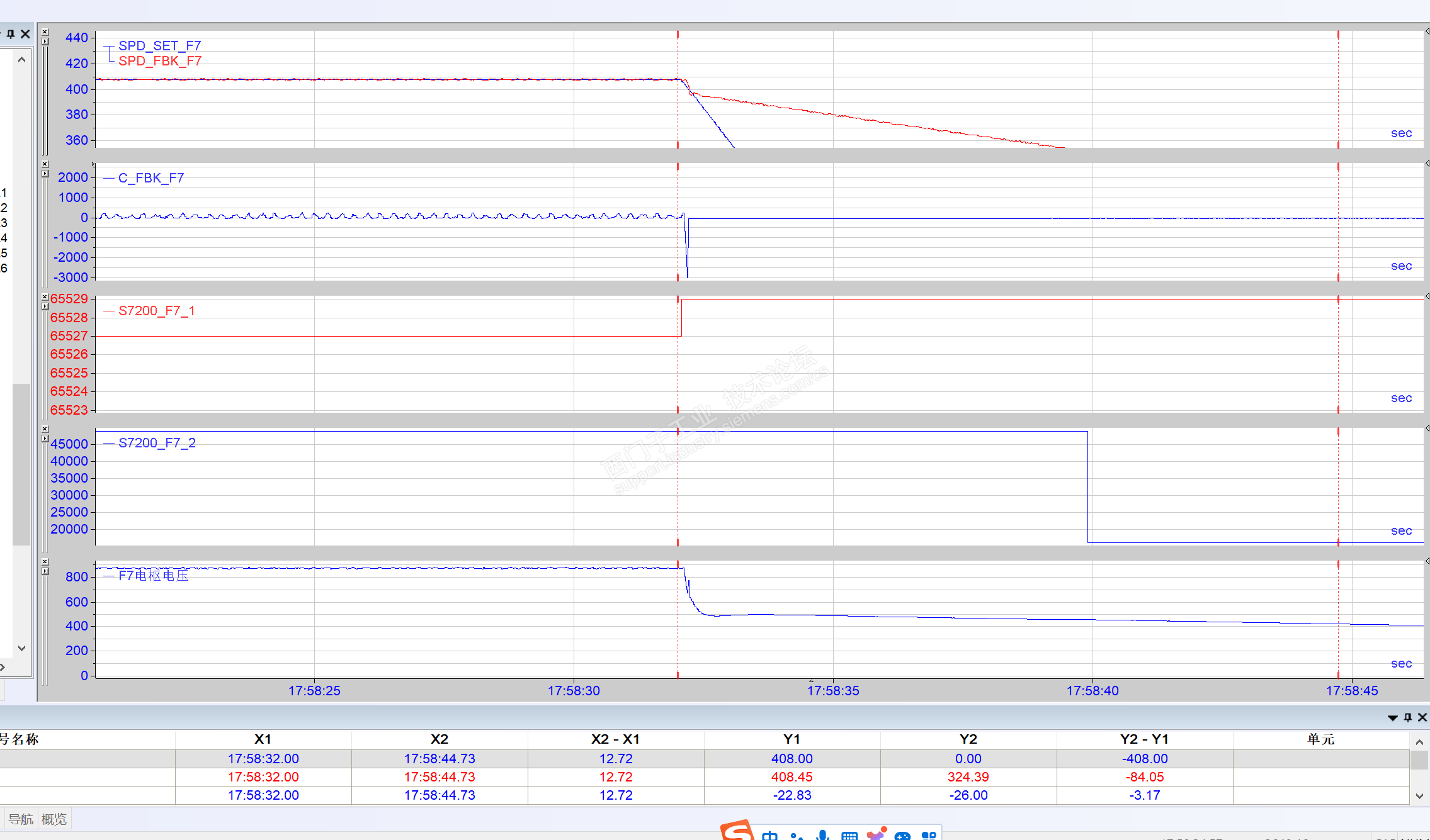 但是实际上,如图, 状态字变化的时候,已经检测到重故障信号了。理论上应该撤销运行信号, 激活OFF2. 但是实际上, 大家可以看到, 系统并没有进入OFF2状态,反而符合OFF1停车的状态。 当然, 由于同时激活了经济励磁40%。 所以导致电枢电压锐减。 同时速度调节器进行调节, 此时已经超过装置的能力, 电流超过了设定值限幅, 报了过流故障,故障触发OFF2响应,迅速衰减电流并封锁脉冲, 所以电流很快到0 了。
