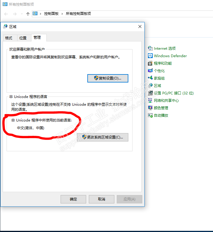 打开 Windows 操作系统的 “控制面板”,对 “区域” 的 “非 Unicode 程序的语言” 的设置一定要改成 “中文(简体,中国)”。见截图所示。