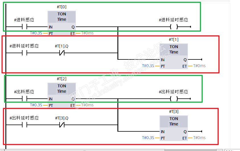 作为初入工控领域的新手,我一开始觉得,对于每个工位的进料传感器,检测到一个上升沿,就认为开始有亚克力板开始传送进工位,检测到下降沿,就认为亚克力板已经完全进入到工位;对于出料传感器,检测到一个上升沿,就认为工位开始往外传送亚克力板,检测到一个下降沿就认为亚克力板已经完全传出了工位。