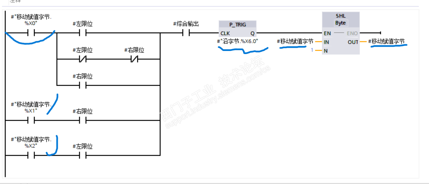 抄了一段书本上 左移指令 写的移动小车的程序,想变成FC块,奈何FC不会用 变量字节访问位的写法,仿真根本没动作。