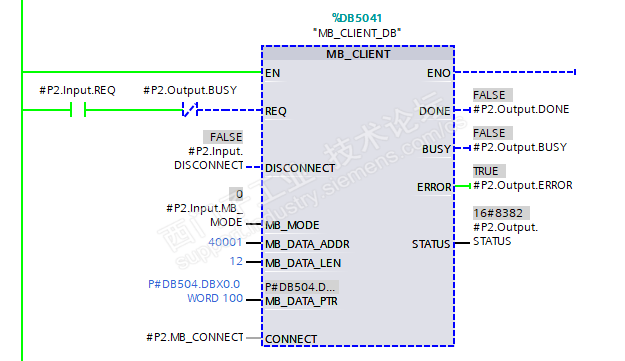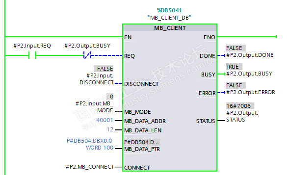 大家好!本人当前遇到一个问题:1500PLC与PAC3220进行MODBUSTCP通讯。我用的MB_CLIENT功能块,采用“添加新连接”的方式。功能块的状态如下面3张图: