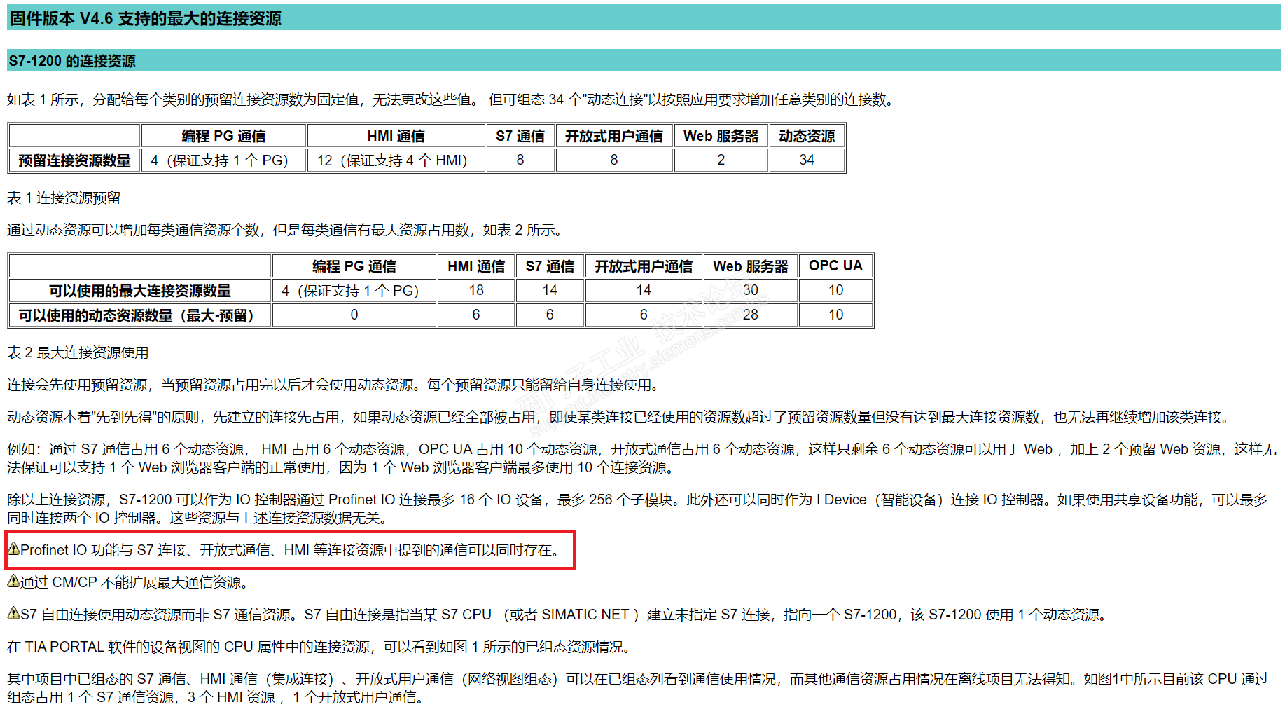S7-1200的连接资源有说明:Profinet IO 功能与 S7 连接、开放式通信、HMI 等连接资源中提到的通信可以同时存在。