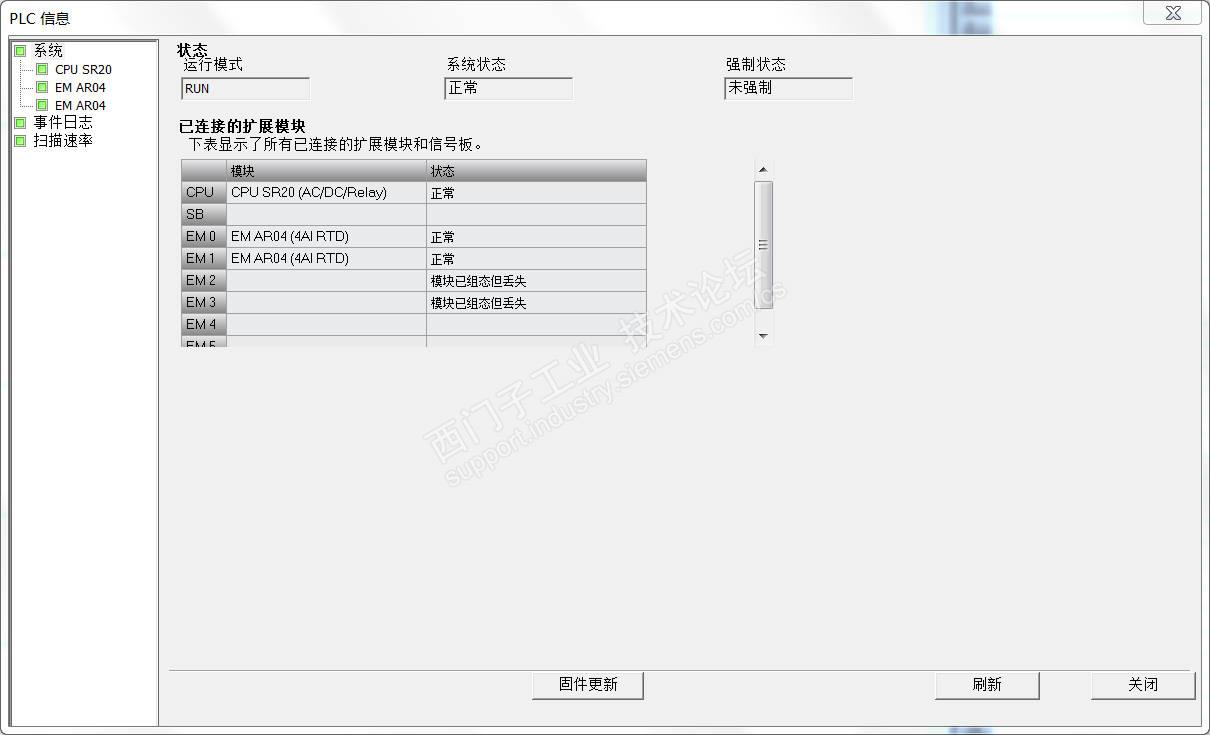 在PLC信息的窗口里发现EM2和EM3显示模块已经组态但丢失,这是什么情况?