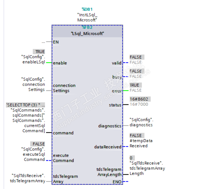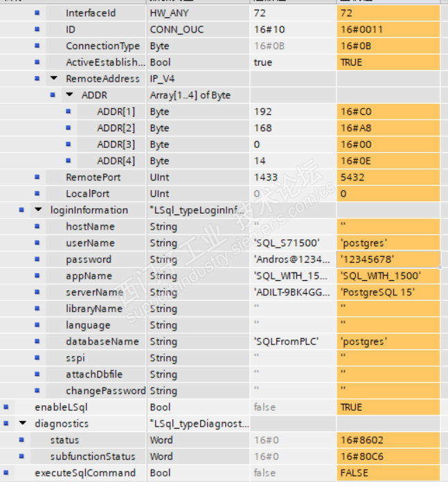 样例程序是基于TCON命令与电脑数据库通讯的, 对应数据块内设定通讯的IP地址,端口设定对应的端口,然后 设定数据库登录用户名 密码 数据库服务器名称以及数据库名称