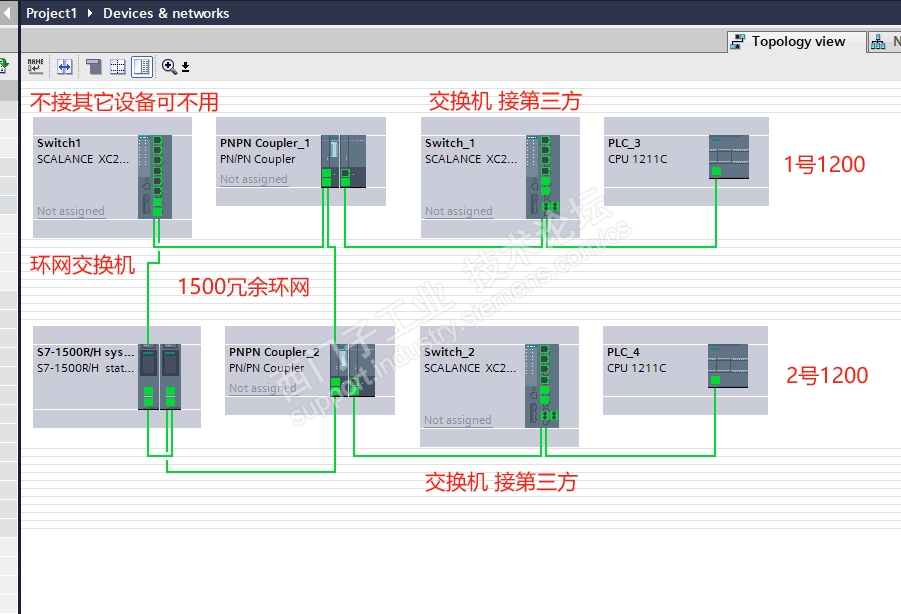 ①1500冗余系统组环网,如果不需要接非MRP终端可以不用环网交换机,所有设备独立组成封闭环网。