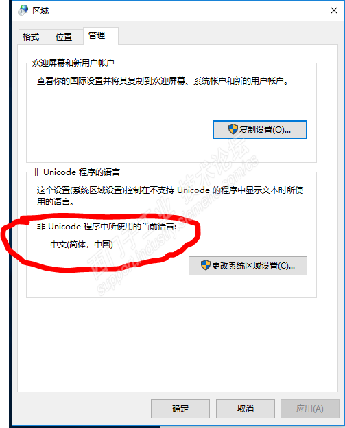在 “控制面板” → “区域” → “管理” 页面的设置中,“非Unicode 程序的语言” 属性是 “中文(简体,中国)” 吗?如果不是,建议你点击后面的 “更改系统区域设置(C)…” 按钮进行修改。修改完成后按照提示重启电脑后再试试看。