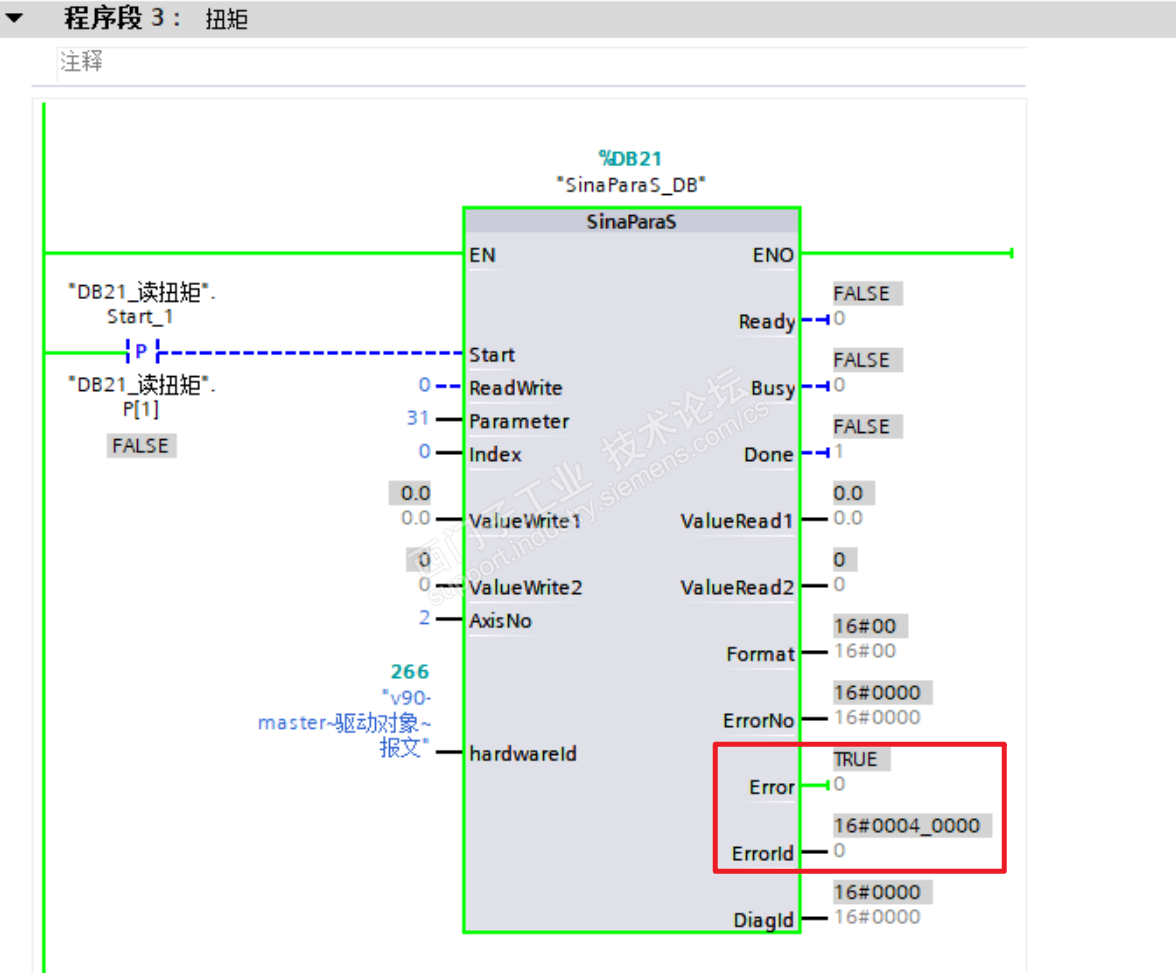 1、1500 使用 105 报文,开启 DSC,工艺对象带 V90 PN伺服。使用 SinaParaS 读取扭矩时报错 16#0004_0000(在激活的数据传输中通过重置Strat输入至“0”来取消作业“ )