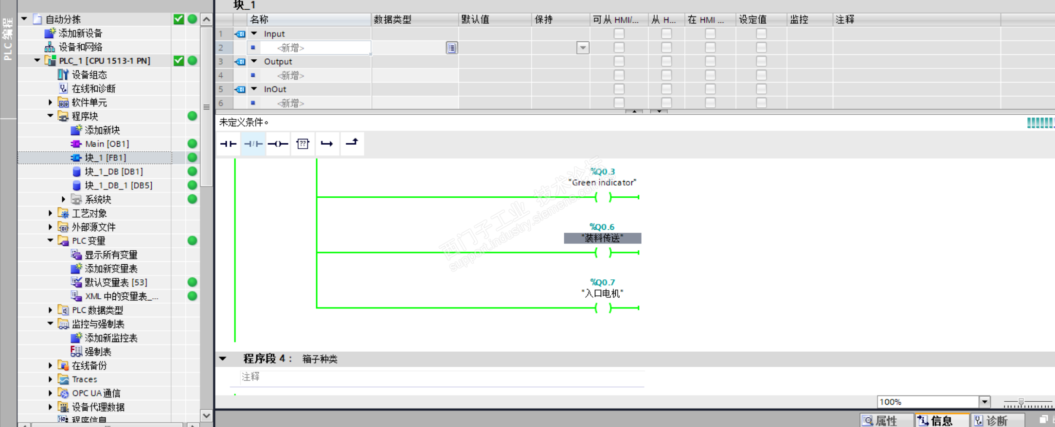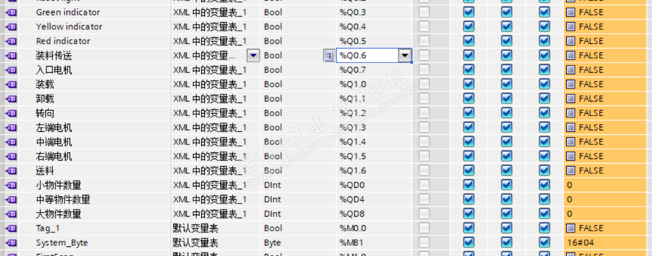 在仿真的时候,在FB内显示10.6是有输出的,但是在显示所有变量的时候没有输出,仿真软件factoryio也监视不到输出,输入正常。