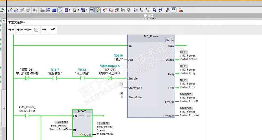 如图,有一台设备用S7-1214C带了4个伺服,使用脉冲控制。其中一个轴的MC_POWER功能块出现了16#8FFF的故障ID,查看了F1信息说是内部错误,在诊断缓冲区里没有发现报错。使用MC_RESET无法复位这个故障,只能重新接通MC_POWER块,复位后可以继续使用但不知道什么时候会再次报错,没有规律。有哪位大神有遇到过这种吗?
