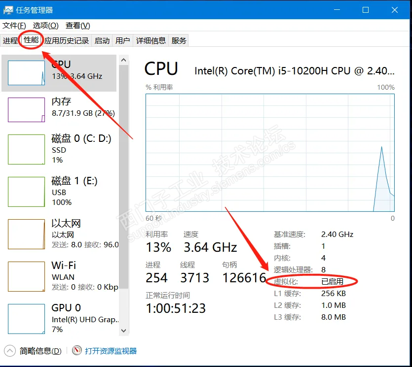 检查电脑是否开启虚拟化,右键点击Windows下方任务栏空白区,打开任务管理器,在左上方选择的“性能”中,查看虚拟化是否开启(如图)。