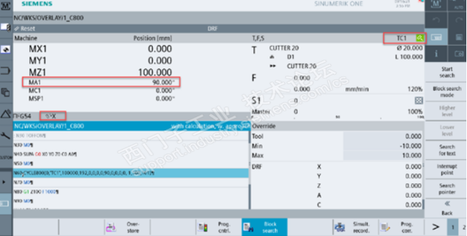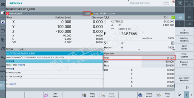 4. AUTO下,激活DRF功能,程序执行过程中,或M0,或激活循环停止等,手持单元选择第3 几何轴Z,通过手轮控制Z轴沿刀具法向运动远离或接近工件