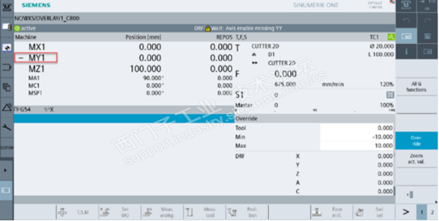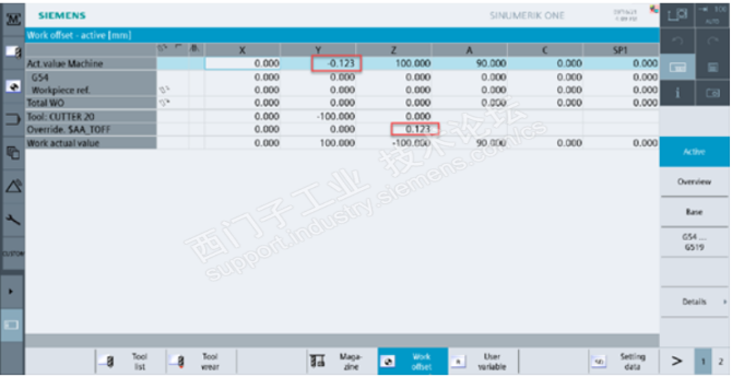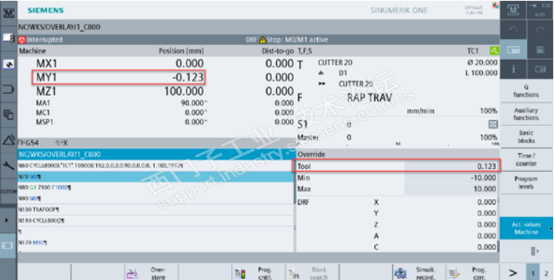 工件零点偏移查看手轮在线刀具长度补偿,几何轴Z偏移0.123mm,实际机床轴MY1偏移-0123mm,