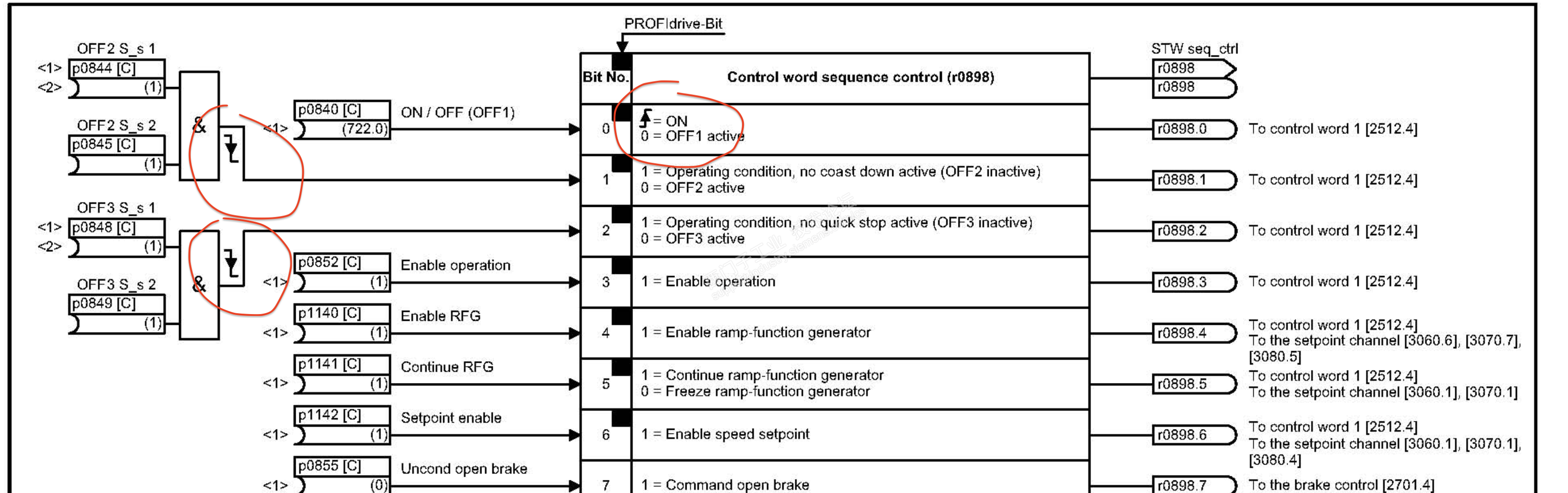 看画红圈,P0840是控制字 ON/OFF的输入,下面722.0说明它连接到了端子1。上箭头说明它(启动条件满足后)需要一个上升沿才能使能。