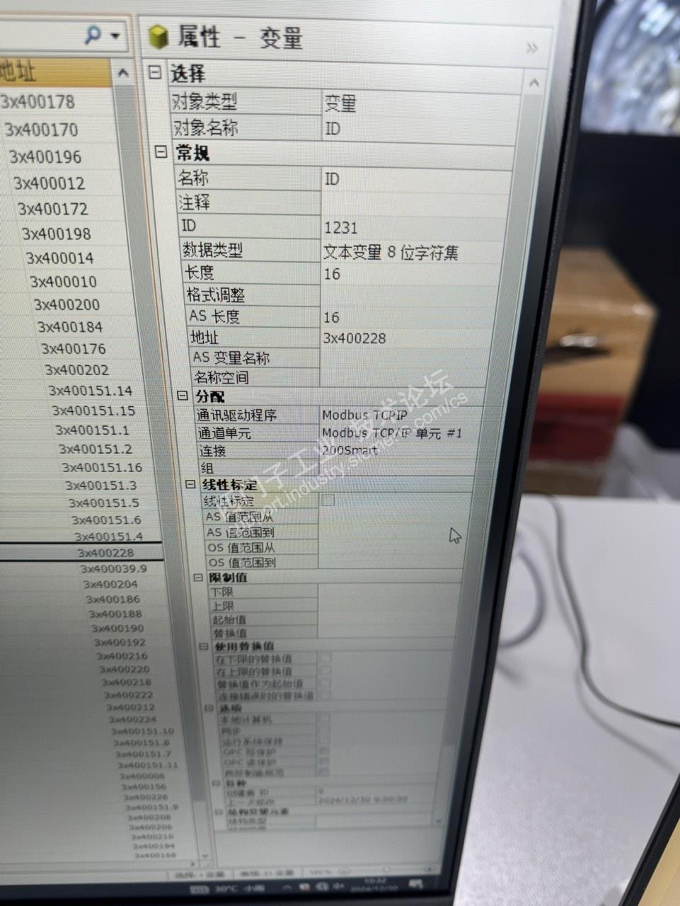 PLC为200smart系列,定义字符串区域地址为VB455(字符串内内容为abcd1234),wincc中地址为3x400228,躲开了第一个字节,从第二个字符开始读取内容。