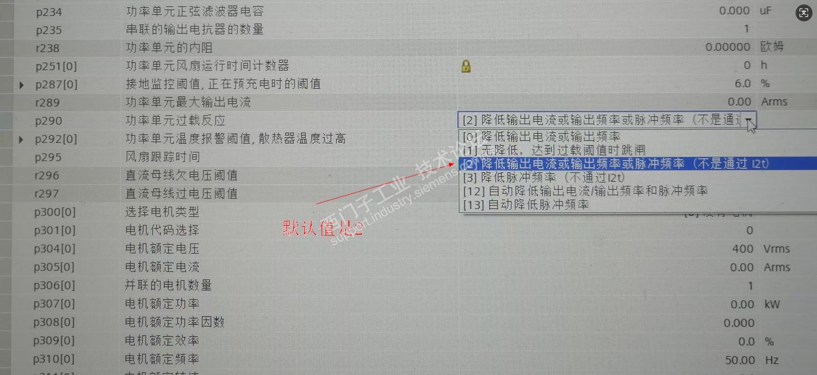 另外,P290功率单元过载反应出厂是2.控制效果是可选的。你希望过载了频率自动下降可以设置0.