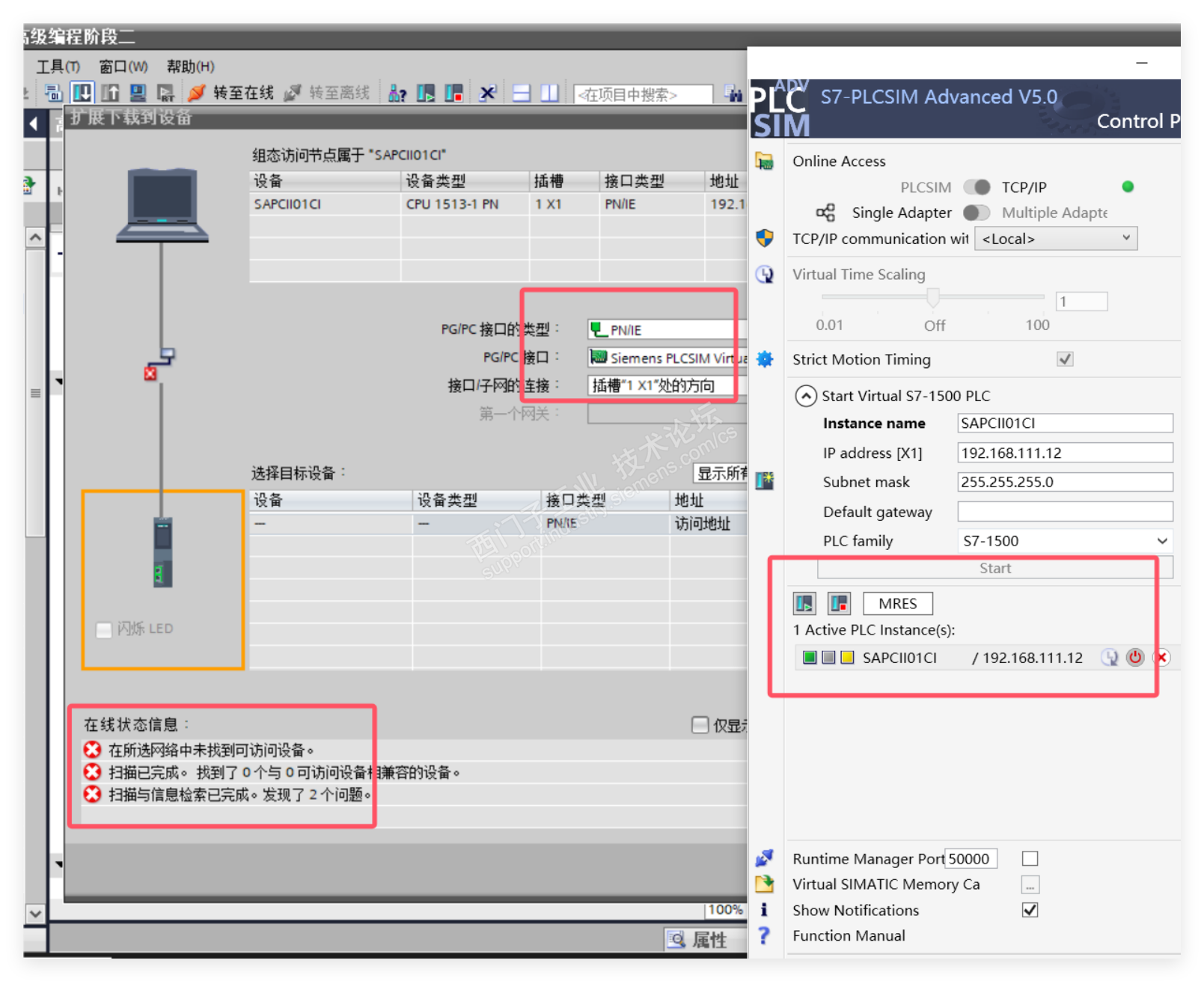 我在上第一节课的时候,按照视频进行操作连接上了。然后,关掉电脑休息。第二天,我继续学习,但是利用博途打开项目,再打开仿真,最后下载程序,但是一直找不到仿真的设备。其它都没有