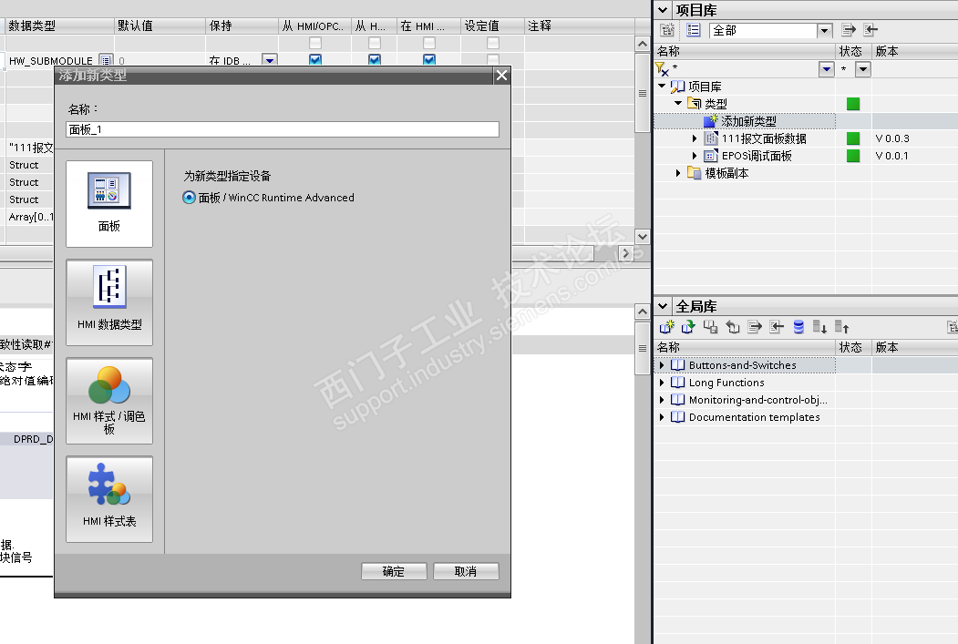 上图中的“1”处就是集成在FB中的面板数据类型UDT,它可以先在界面左侧项目树中的PLC数据类型中建立,也可以在界面右侧的项目库中新建“HMI数据类型”。“HMI数据类型”就是“面板”的背景数据,所以图中的“2”处有两个类型(面板+HMI数据)
