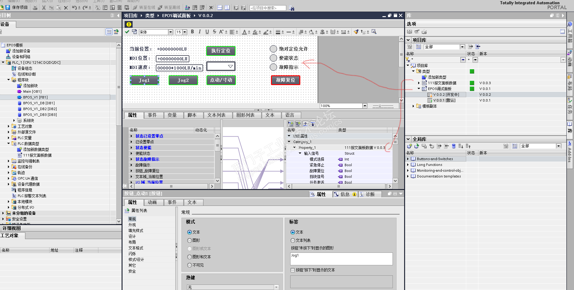 看,左边项目树只有PLC一个设备,但右侧项目库里已经做好了面板模板,每一个EPOS轴都会有自己的调试面板,无论你新建哪种HMI设备,创建新的HMI设备之后,只需将做好的模板拖放到画面中,指定一个UDT给它,你就可以迅速开始调试,并且这种面板是在你的用户HMI上的,不是伺服驱动调试软件上的哟!
