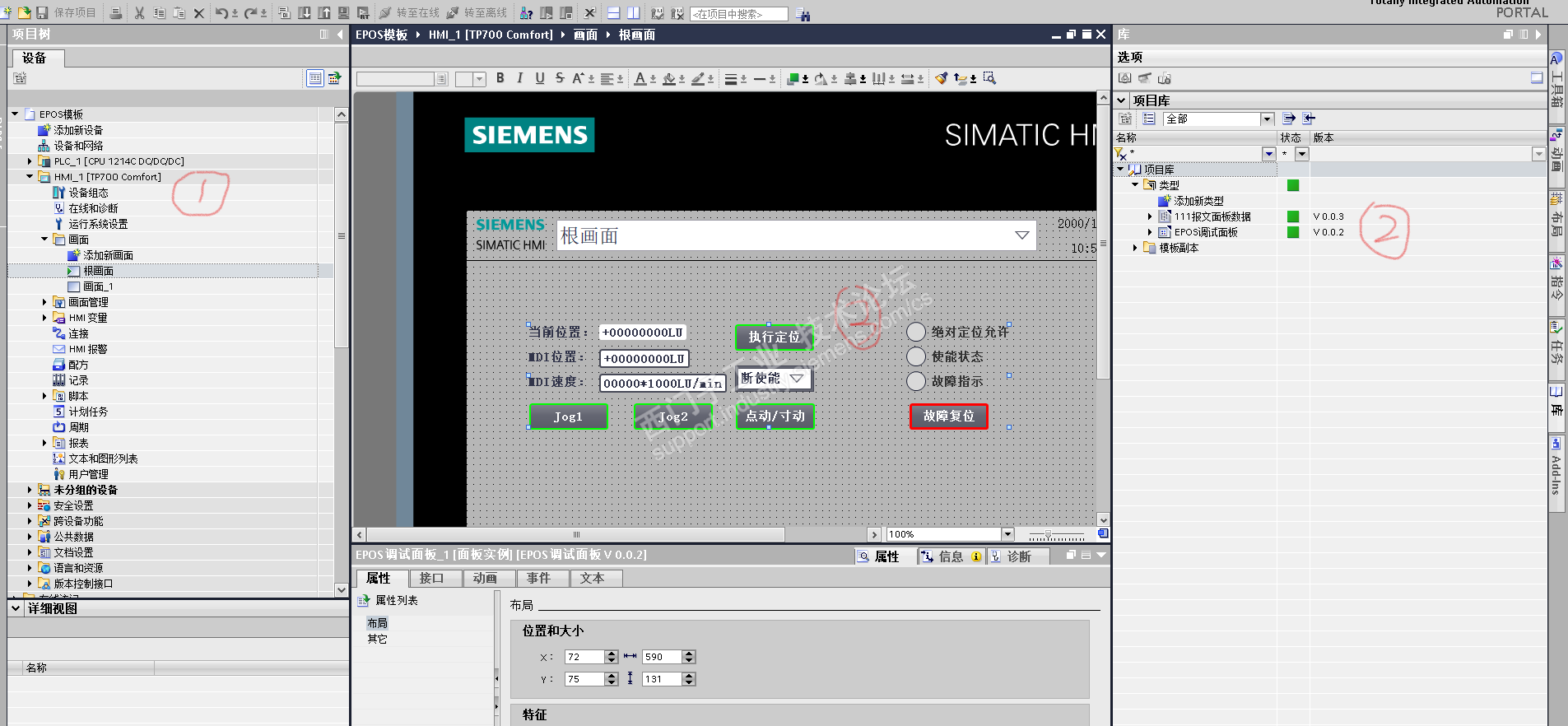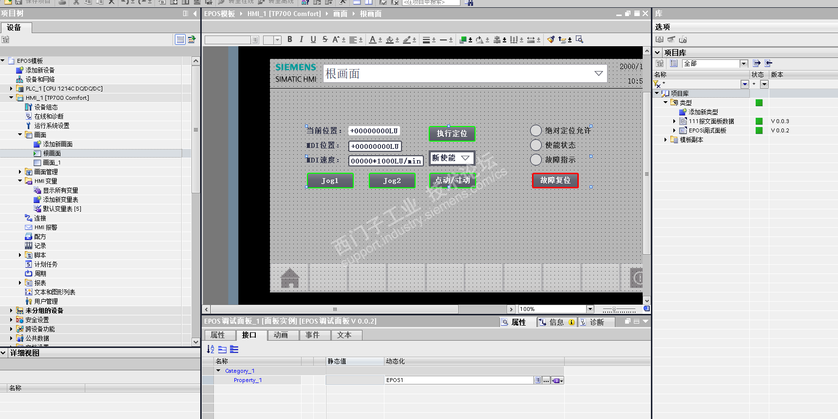 2,打开项目库,把面板模板“EPOS调试面板”拖放到画面上;