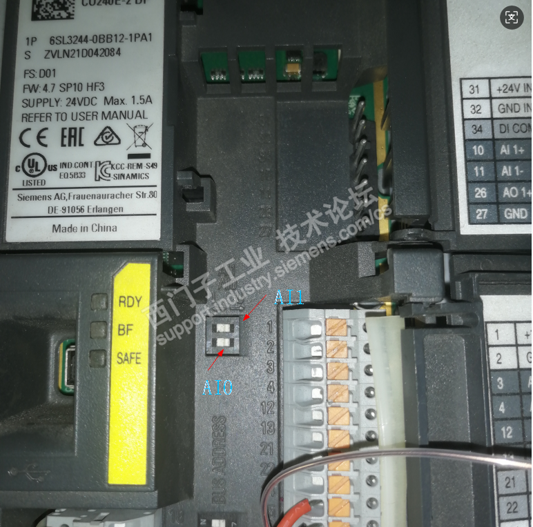 还有的检查变频器的电流输入电压输入的选择开关拨错位置,下面那个是AI0,向右拨是电压输入向左拨是电流输入,控制的是通道AI0的。选择开关上面那个是AI1用的,和电位器接入10,11的是一起用的。