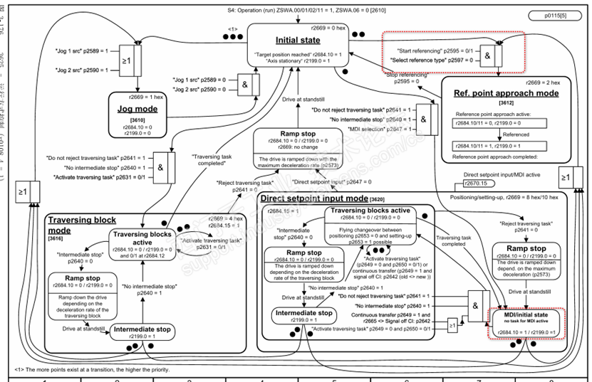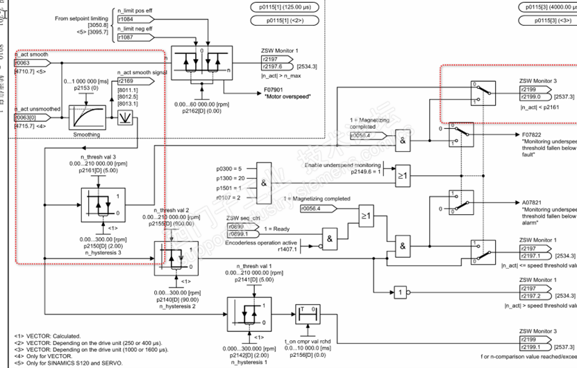 |n_act| < speed threshold value 3 这个条件发现 有时候这个点为0,而此时虽然我自己PLC判断电机是静止的,并且SINA_POS能正确给出开始回零的控制位但此时驱动器内部并不能满足EPOS切换到搜寻参考点状态的要求,因此不能正常触发回零,通过功能图发现是P2161和P2153这个参数引起