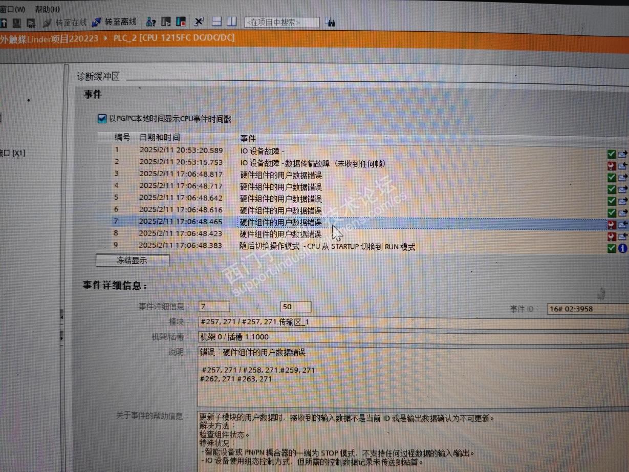PLC型号为1215,PLC启动时报数据错误,两个远程IO偶尔报IO设备故障,诊断见下图