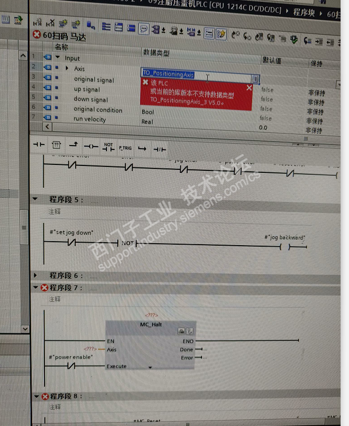 如图 想做一个轴的控制FB块 然后轴指令版本是V5.0 就报错 ,,,如果我把轴的指令版本选择V4.0就无问题,各位大神如果不想它报错 那数据类型要填什么