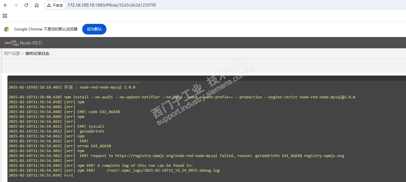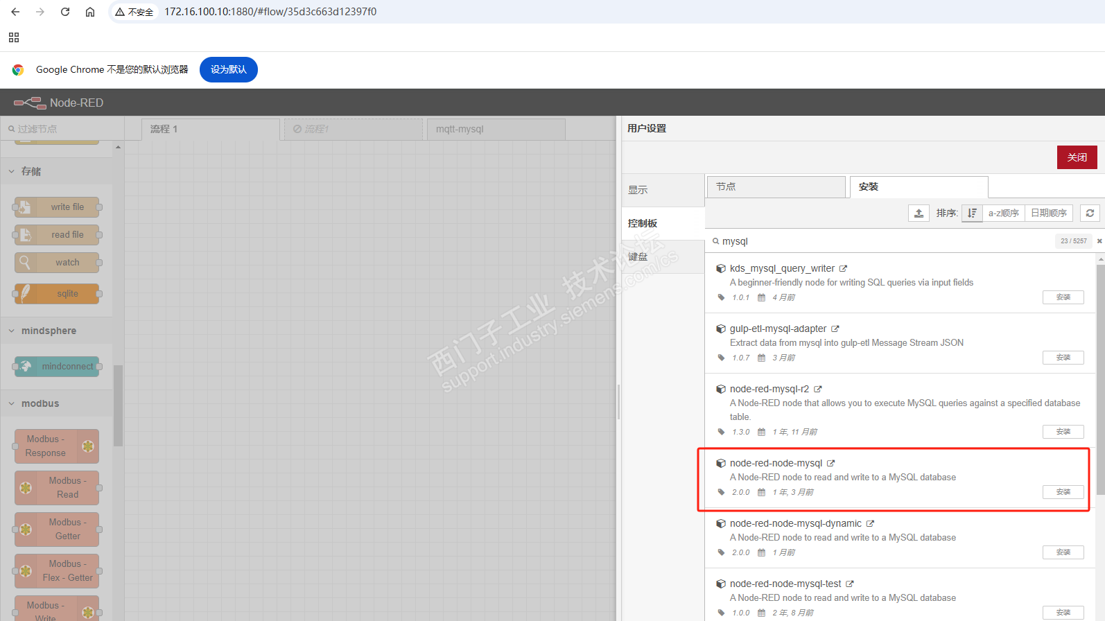 本地127.0.0.1:1880运行node-red可安装node-red-node-mysql节点,但IOT2050(172.16.100.10:1880)运行node-red无法安装node-red-node-mysql节点,电脑node-red版本V4.0.9,node.js版本V20.12.2;iot2050的node-red版本V2.2.2