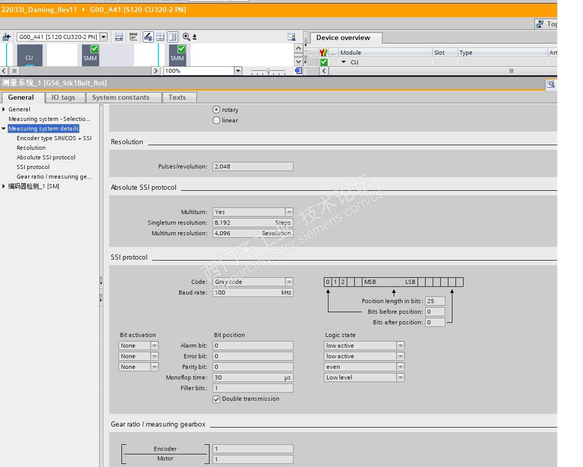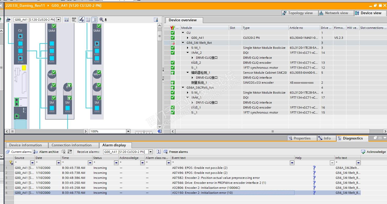 2、博图里如果选择sin/cos+SSI这个类型信号,只能用SMC20模块(电源已经加了电阻提高到了10V,应该没问题),但是设置后系统仍然报警提示初始化错误,提示和警告代码如下图,不知道什么原因?