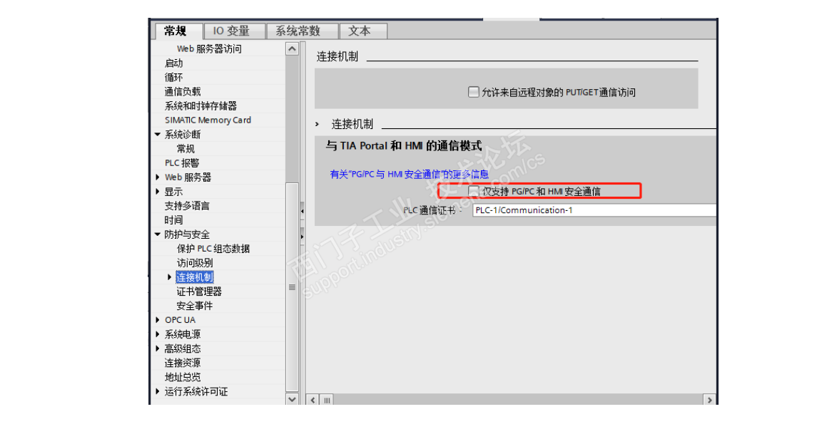 在连接机制中将“仅支持PG/PC和HMI安全通信”勾选去掉(默认是勾选状态)