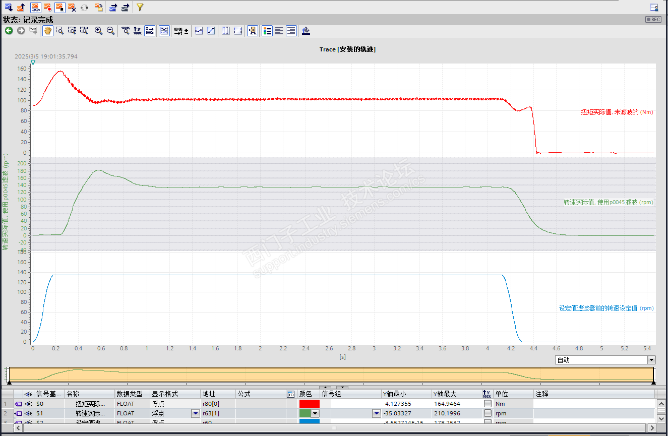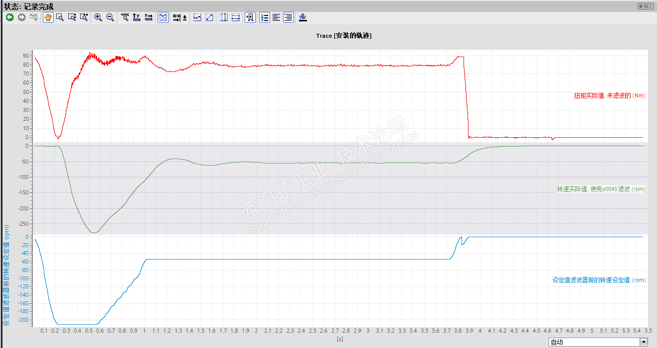 如图这个是点动上升的,顶峰扭矩达到了近160NM,速度跟随误差也比较大。