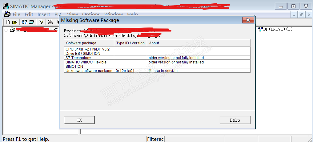 如图,STEP5.6/5.7打开PLC程序后总会S7-technoloqy低或缺失,还有缺少未知的软件安装包,恳求大佬指点下,如何解决,我想打开原程序看,实际打开都不显示PLC。谢谢了!