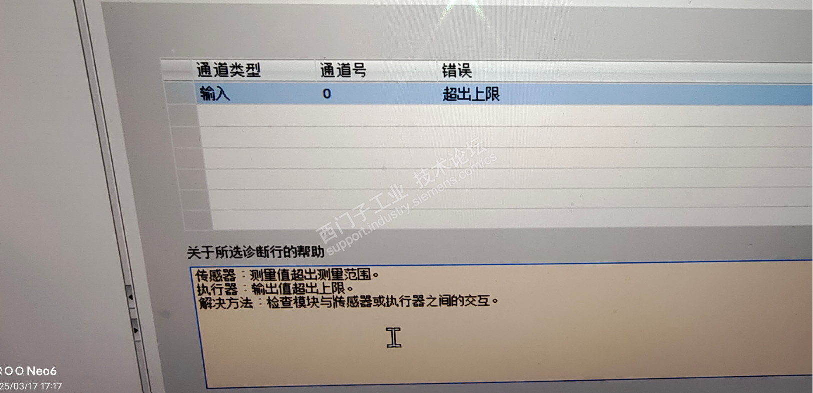 模拟量模块报错,检查模块与传感器或执行器之间的交互。气压传感器是电流4-20ma输出模式,上个工程师配置组态成电压采集,个别模块满量程。昨天全部改成电流采集后模块报错检查模块与传感器或执行器之间的交互。三个模拟量模块就中间一个报警,8个通道全红,改回电压模式还是报错。是不是模拟量模块坏了。6ES7 231-4HF32-0XB0 SM 1231 AI8 把二号模块的0通道线路拆了还是报错