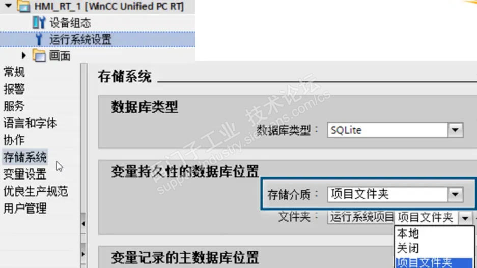 ⅰ. 内部变量:一般是只在WinCC内部使用的变量。内部变量可以在属性里面勾选上保持后,退出运行系统之后,变量值可以保持,再次启动后,内部变量就会自动恢复到退出之前的数值。数据保持的位置可以进行设置,保持存储的数据库,在运行系统设置-->存储系统里面可以设置,一般情况下都保持到项目文件夹内。