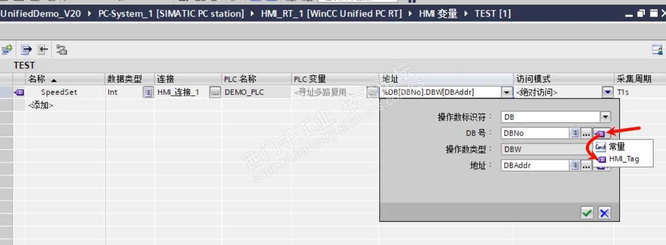 a. 绝对地址寻址方式:可以直接把数据块编号,对应的绝对地址使用内部变量进行简介寻址,改变其地址来实现多路复用的功能。创建这种方式的寻址方式的时候,根据需要输出变量名称和数据类型、要连接的PLC,然后访问模式选择绝对访问,在地址属性点击下拉框,在DB号和地址属性里面,点击最右边的那个按钮选择HMI_Tag,然后选择对应的变量,这个变量内部外部变量都可以。如果是I、M、Q类型的地址,那只在地址栏里面选择就可以了。